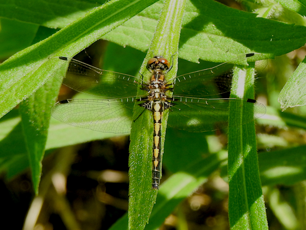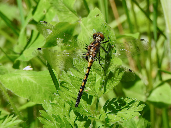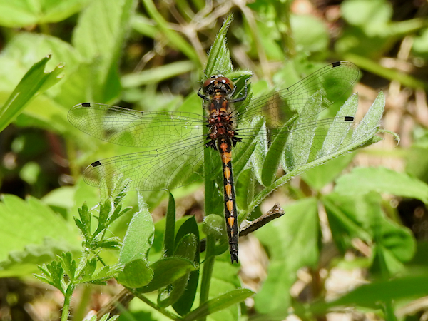 We left the taxonomically confused clubtail to its own devices, then spent some time exploring a small clearing on the other side of the trail where we found a few more immature whitefaces. One was a yellow-form female Hudsonian Whiteface – I hadn’t realized until reading up on them later that (like certain darners) female Hudsonian Whitefaces can come in two different colour forms: black and yellow like immature whitefaces, and red and black like mature males. She still had the prominent yellow veins within the black triangular wing markings, making her easy to identify.