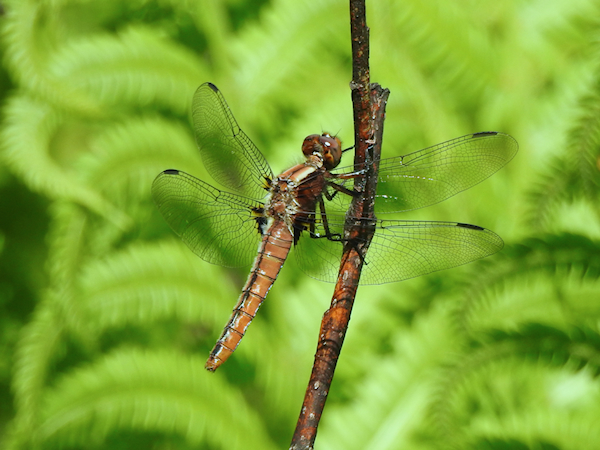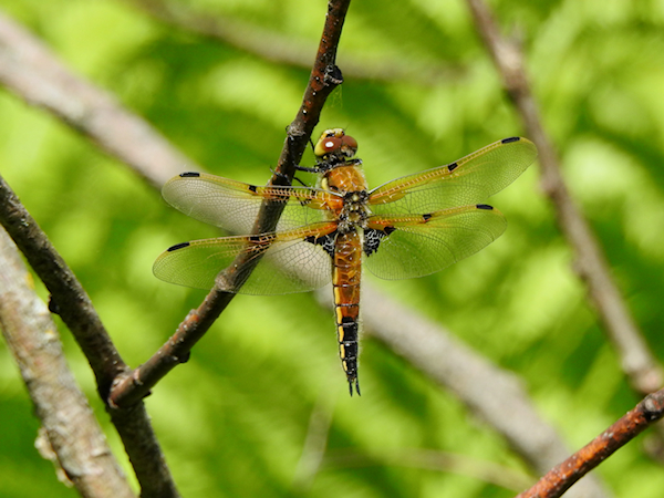 And there were dragonflies! Quite a few were flying up and down the road and over the vegetation in the ditch, most of which appeared to be baskettails. When I checked the grasses and shrubs of the ditch I noticed a few dragonflies resting on perches, hunting, including one Racket-tailed Emerald and a few teneral whitefaces which were black and yellow. My favourite was this beautifully fresh Four-spotted Skimmer, an eye-catching dragonfly that is bright golden-orange when it emerges.