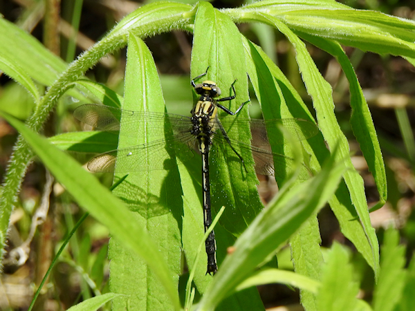 We finally came to a bend in the road that was only a short distance from the water; however, we were transfixed when we spotted a clubtail perching awkwardly in the vegetation. Most clubtails perch horizontally on the ground or atop logs or on a branch, but this one appeared to be hanging from a leaf. There is actually a group of clubtails known as “hanging clubtails” – Genus Stylurus – not because they execute lawbreaking odes with a rope, but because, unlike most gomphids, they perch vertically while hanging from the vegetation – just like this one was doing.