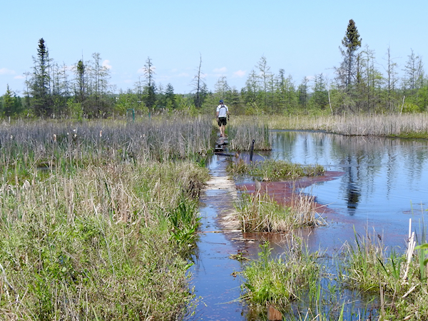After giving the clearing a thorough scan for other odes, we returned to the trail then made our way down a short forested slope to the edge of the water. As is typical with most bogs, a “moat” of standing or slow-running water, called a lagg, separates the bog from the land surrounding it. This transition zone receives run-off from the domed bog and helps to maintain the bog’s water level. To our disappointment the water of the lagg was so high that parts of the boardwalk were submerged at least an inch below the surface. Chris took off his shoes and started walking across, warning me that although the water was warm, the boards were slippery. He also noted that there were a few mature male Hudsonian Whitefaces perching in the vegetation close to the boardwalk.