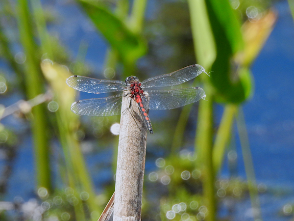 I didn’t want to have to cross the boardwalk with my shoes on top of all my other gear, but I did want to see the dragonflies that were flying in the reeds so I took my shoes off and walked out into the water with only my camera, leaving the net behind. There I spotted the Hudsonian Whitefaces, and what a treat it was to see their bright red colours and glittering wings among all the green of the vegetation! Unfortunately they weren’t as close to the boardwalk as I would have liked, but I did enjoy watching them hunt and chase each other from a favoured perch.