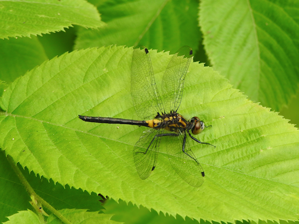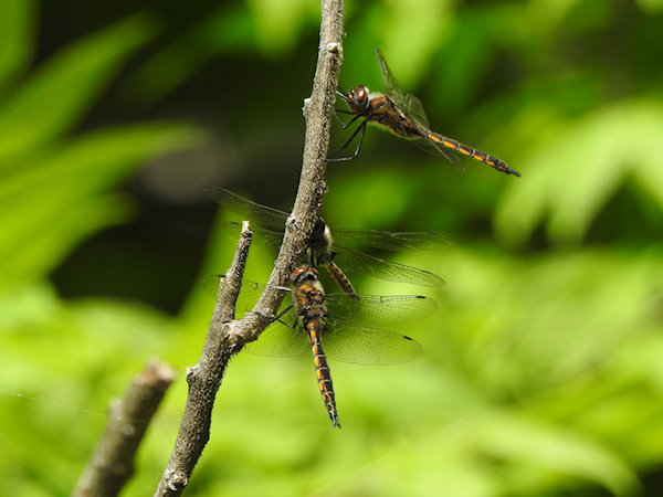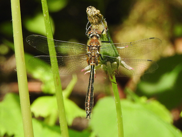 This is one of the earliest flying dragonflies in our region, and one of the first emeralds most beginners see and learn to identify as it breeds in accessible beaver ponds, marshes, lakes and fens, particularly those adjacent to forest, and perches often. The dark, moderately clubbed abdomen has a whitish-yellow ring at the base, and its thorax is bronzy-brown with metallic green areas. The thorax is furry in appearance, which helps keep the body warm during those cool spring nights, and lacks the yellow lateral stripes and spots of the Somatochlora emeralds. While males often patrol their territories along the shoreline, both males and females can be found perching vertically in the vegetation away from the water, usually below knee-height – just as this one was doing.