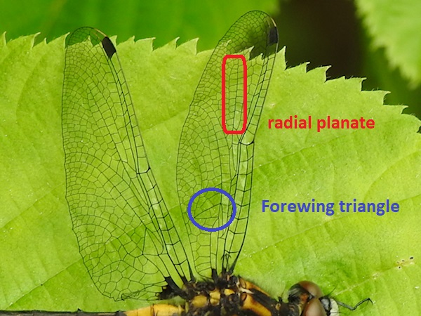 Fortunately I got a crisper image of the forewing which helped me to definitively identify this as a Belted Whiteface. In the enlarged image below I have labelled the forewing triangle which, according to Ed Lam’s field guide to all the dragonflies of North America, has three rather than two cells on the distal (furthest from the body) side. It also shows the single row of cells called the radial planate that “hangs” from the fourth line of cells extending from the nodus to the outer edge of the wing. There are two rows of cells in this area on Crimson-ringed Whitefaces.