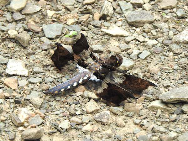 When I arrived, the first dragonfly I noticed was an immature Chalk-fronted Corporal on the ground in a small clearing halfway between the parking area and the first large opening. I took a few photos for iNaturalist then continued on my way. I spent some time checking the edges of the corridor, scaring up a Juvenal’s Duskywing butterfly, a couple of Sedge Sprites, and a Common Whitetail as I went. This is an immature male, which I see less often than females and mature males. You can identify it as a male by the thick, solid dark brown patch on each wing and as an immature by the yellow spots down the sides of the abdomen.