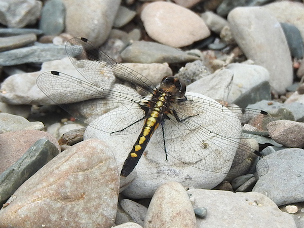 The last immature whiteface I photographed was a Dot-tailed Whiteface on the beach. The yellow abdominal spots are wide and run almost the full length of each segment except for the spot on S7, which was much shorter and wider than the ones above it. It most resembles the Hudsonian Whiteface but lacks the yellow veins in the black patch at the base of each hindwing. Note also that its abdomen is shorter than that of the Belted Whiteface: not as much of the body protrudes beyond the lower edge of the hindwing as it does in the Belted Whiteface.