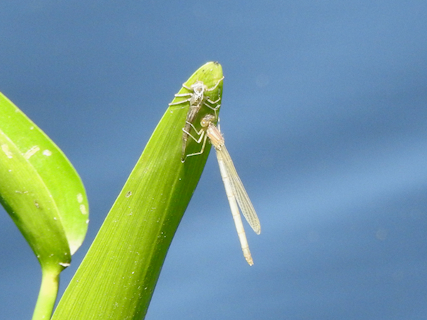 I checked the vegetation for other odes and saw one colourless damselfly that had just emerged from its larval skin. I bet if I had stayed longer I would seen more climb out of the water and finish the process of transformation from crawling underwater critter to an aerial predator.