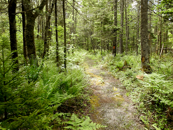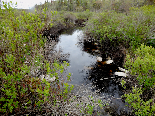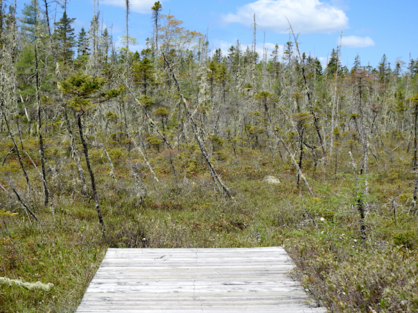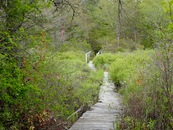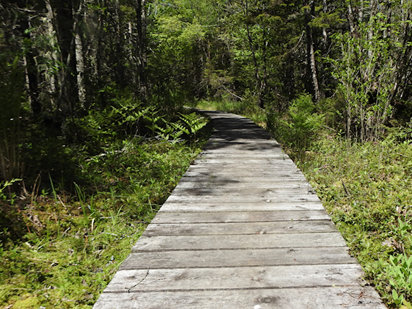 The beginning was an easy walk through typical northern forest habitat reminiscent of Algonquin Park with lots of ferns and spruces. The trail required a few short boardwalks to cross over the wet spots before leaving the woods and entering open areas that reminded me of the bog at Mer Bleue. Only one of the boardwalks had any water below it; the rest were dry.