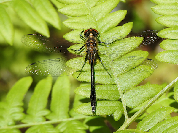 Then I scared up a larger dragonfly, the first of the day, from the vegetation growing next to the trail and watched it fly off. Fortunately it landed close enough to the trail to identify it as a Four-spotted Skimmer. I took one sub-par photo to document it in iNaturalist before it flew off again. I found some colourful moths and a new Flower Longhorn Beetle on a bunchberry flower before turning around about 1.5 km from the entrance, having gotten nowhere near the river. Although it was sunny I didn’t see any other dragonflies flying in the openings in the woods until I found a narrow clearing with at least three small dark emeralds flying about. One started swooping low in front of a fern, and just before it landed there I thought to myself that it was just like a Racket-tailed Emerald to land on a pretty, sunlit fern instead of a broadleaf. Sure enough, that’s what the dragonfly did, and with the thick abdomen and slightly flared club I had no reason not to think it was not a Racket-tailed Emerald – until I downloaded my photos and took a good look at them.
