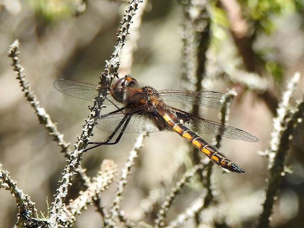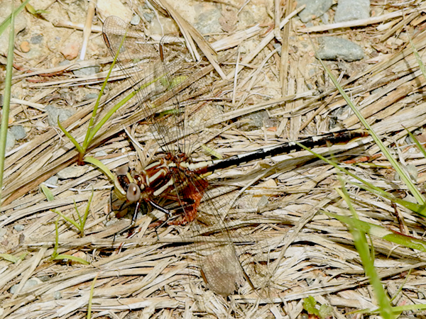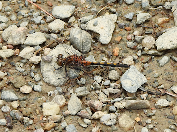 There was at least one other Phanogomphus species in the area which I ignored. Then I saw another dragonfly perching on the ground, this one a Hudsonian Whiteface that was in the process of changing from black and yellow to black and red. You can see the diagnostic light-coloured veins in the dark patch at the top of the forewing closest to the bottom.