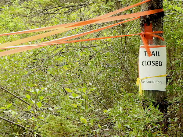 I came across some tape and a “Trail closed – poor conditions” sign at a side trail along the way, but the main trail was walkable, if narrow, and I figured I would keep going until the conditions became too poor to continue.