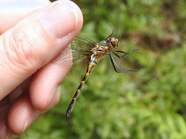 Unlike the male Petite Emerald, the female has yellowish-orange markings down the length of her abdomen. She lacks the yellow thoracic markings of the Somatochlora emeralds and instead is more closely related to the Racket-tailed Emerald, which together are known as the “Lesser Emeralds”. This one was still an immature as her eyes are still brown. Once I was done examining her I put her on a plant and took some photos while she rested.