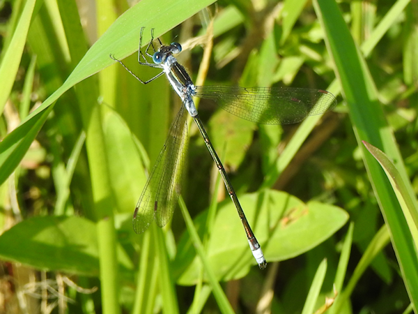 There were only two Eastern Forktails, but quite a few spreadwings. I was only able to identify one from my photos (I managed to photograph it from the right angle to show the teeth of the cerci, AND they happened to be in focus) so it is possible that there was more than one species here. My observation of the below spreadwing on iNaturalist was rated as research-grade due to the supporting photo of the cerci. The identifier, Guy Lemelin – an experienced ode-hunter in Quebec – also noted that the color of its eyes conforms to most of the Northern Spreadwings in the Northeast, as does the appearance of the thorax and the almost dark superior part of the abdominal segment 8. While I did not know that colour could be used to separate the similar-looking Northern and Sweetflag Spreadwings, I have noticed that Sweetflag Spreadwings in the Ottawa area often have three fully pruinose final segments, though I am not sure how reliable this is.