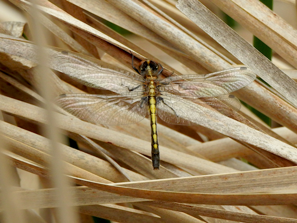 The next place I checked was the clearing in the woods that had formed when several large pines came down during one of the windstorms a few years ago. I’d had Chalk-fronted Corporals along the ground on a windy day last year, and sure enough, I scared up a few more here. From there I went to the boardwalk, where I found another couple of Chalk-fronted Corporals, a bluet – perhaps a Familiar Bluet – in the vegetation above the water, and two fresh Dot-tailed Whitefaces perching in the dead reeds beyond the boardwalk!