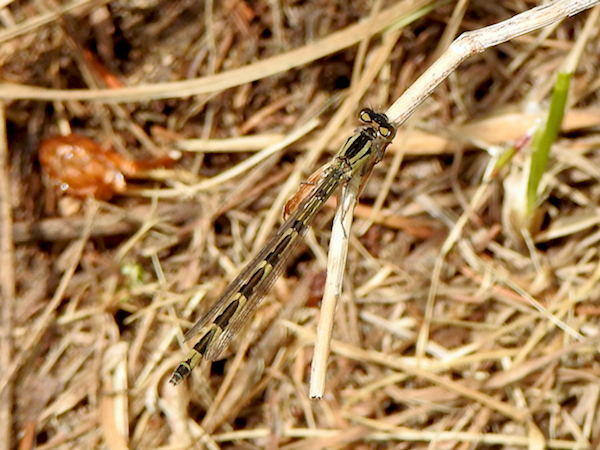 On my way back to the car, I finally spotted a damselfly resting on the ground beside the asphalt path. It was yellowish-brown with black markings; an immature bluet of some sort, and striking with the rocket-shaped pattern down its abdomen. It blended in with the dead grass so well that it occurred to me that if they didn’t turn electric-blue at maturity, I would probably never see one!