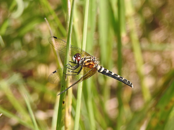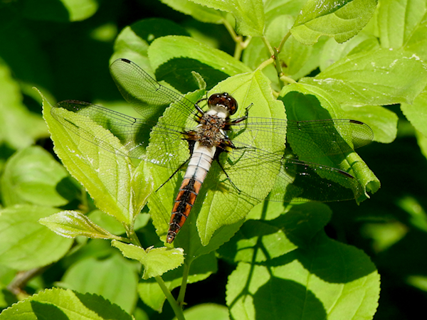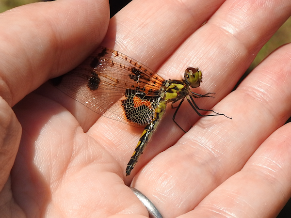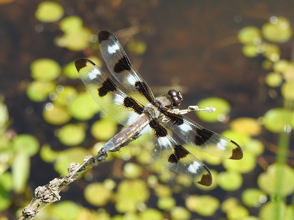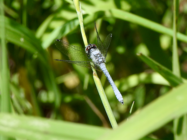 A Four-spotted Skimmer perching above the water was great to see, as was a male Eastern Pondhawk with a half-black abdomen. It looks like some black substance had gotten on his body given the small blue areas showing through in some spots.