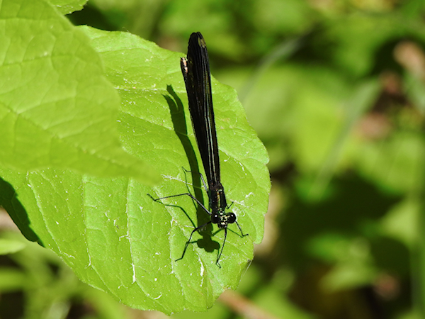 The earlier visit meant we had a better chance of seeing and hearing our targets, and when we started at 9:00 am, we headed into the woods along a section of the McParlan House Trail to listen for the Cerulean Warblers. Our chances of seeing these warblers was slim, as they prefer to forage and sing high up in the canopy, and the leaves were fully out. Most woodland birding in the summer consists of ear-birding, and we studied the song of this bird before heading out. I brought my net in case we saw any interesting odes in the woods, and it wasn’t long before we started seeing Ebony Jewelwings perching on sunlit leaves along the trail.