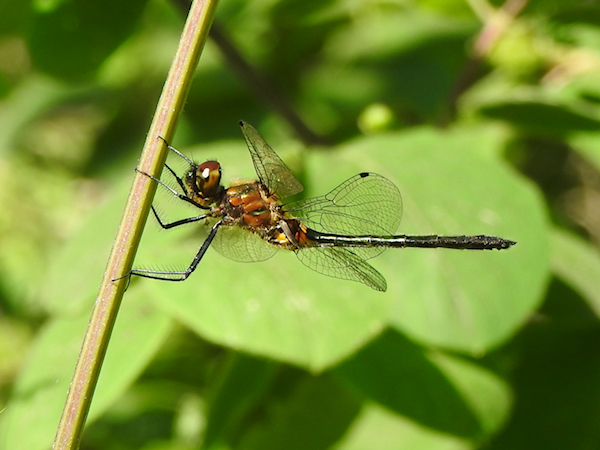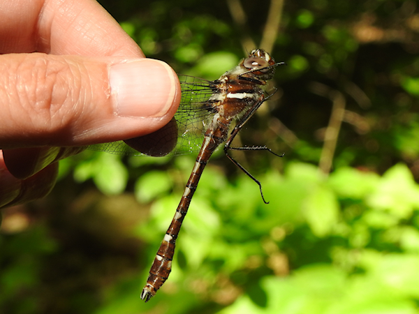 The large emerald swarm above the meadow enticed us to stay, but we had little luck in catching them. Chris had better luck than I did, as his net has a longer reach, but we caught both Spiny and Common Baskettails. At least one or two dragonflies looked suspiciously like one of the larger Somatochlora emeralds but we were not able catch them. I did not see anything that looked like a Brush-tipped Emerald, one of the small Somatochlora emeralds that I’d found here last year on July 1st. However, we did find a Racket-tailed Emerald posing nicely when it landed in front of us.