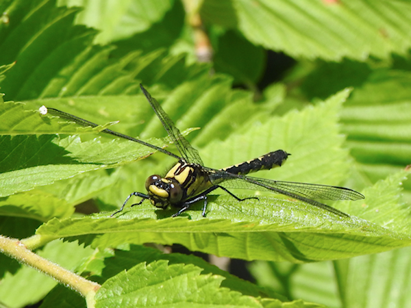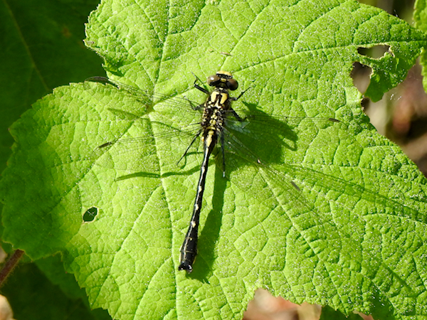 Mustached Clubtails are described as “common small river clubtails” in the Paulson field guide Dragonflies and Damselflies of the East, though they aren’t really common in our area – the Ottawa Checklist describes them as scarce and local. They live in streams and rivers with currents that can vary from slow and lazy to swift with rocky riffles, usually with sand or mud bottoms. Males are often found resting on rocks close to the water’s edge or perching on the leaves of trees and shrubs up to about six feet. During the hottest part of the day, both sexes may leave the water to perch on broad leaves in nearby sunny clearings.