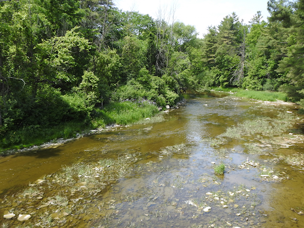 We debated whether we should head to Morris Island or Fitzroy Provincial Park next, but I still thought the additional river and creek habitat of Fitzroy might hold some interesting species. I paid at the gate and and asked which areas of the park had the best river access. The park wardens recommended the Carp Trail, a one-kilometre loop that follows part of the Carp River. Eagerly we set out, and found the trailhead next to the bridge over the Carp River. We followed the trail until the forest floor descended to the same level as the water, then began walking along the shore instead. It wasn’t the prettiest river – it was a dirty brown colour and choked with grasses or sedges that lay flat against the surface. There were some rocks in a few places, but those on the shore looked the uniform gray of dried mud. It looked like the water had been higher at one point, for the mud close to the water was very slippery – I almost fell a few times. There was a large island close to the shore, and Chris and I spent some time walking around and watching for odes.