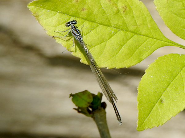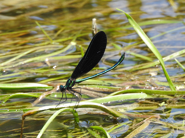 There were lots of Ebony Jewelwings in the vegetation, their black wings snapping like velvet butterfly wings as they perched. Powdered Dancers were common, and two Common Green Darners chased each other up and down the middle of the channel. I saw one Eastern Pondhawk, and then something big flew in and landed on a rock, head pointing down. I saw the green eyes, but before I could take a step closer or get a sense of what it was it flew off.