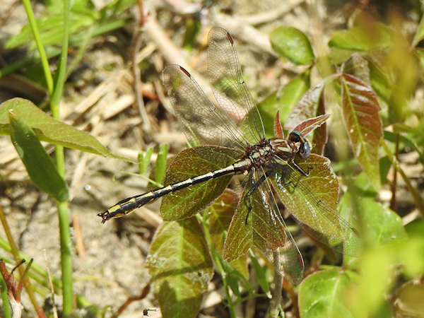 We turned around and headed down the beach in the opposite direction. It was full of people, but most paid us no attention as we scoured the vegetation. Chris was walking closer to the base of the escarpment than I was, and when we came to a shrub he stopped on one side, and I stopped on the other for we each found a small clubtail resting on a leaf! Chris said his was facing me, but the one I saw was facing the left so we had two different individuals! I only saw the one, and as it was about head height, I was able to get some great pictures of its face showing the distinctive black markings. I didn’t get a classic shot from the top, but from what I could see it was a female.