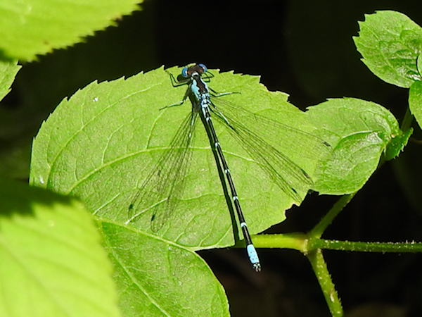 I spotted a spiketail flying up and down the stream, but when I tried to get to the bank in the woods where I had seen the Twin-spotted Spiketail hang up once upon a time, the way was blocked by fallen trees. I waited for a while to see if it would land in one of the shrubs along the trail for a while, but when it didn’t I continued on my way. I still hadn’t seen an Aurora Damsel yet, and I was hoping to find one here before I headed over to the Cedar Grove Nature Trail next. It didn’t take too long before I finally found a male sunning itself on a leaf.