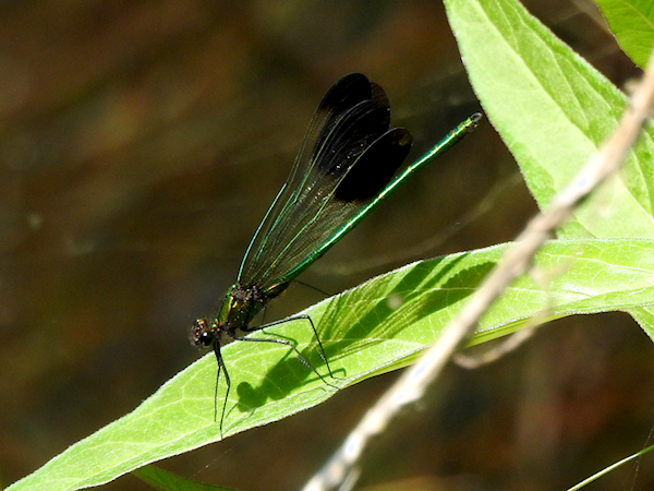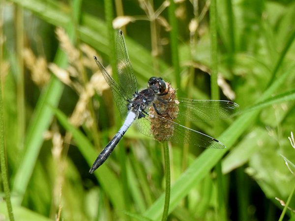 There were only three species there including the common Ebony Jewelwing and Racket-tailed Emerald, but the third was entirely new for Marlborough Forest: a River Jewelwing! It was a female, and I grabbed a few distant shots before heading down the trail. It marched along the edge of a wetland for a while; the water must have been high, for it spilled onto the edge of the trail. Unfortunately I only managed to walk 0.4 km before the trail disappeared underwater and became a wall of cattails, but in that time I added Sedge Sprite, Four-spotted Skimmer, and Dot-tailed Whiteface to the day’s list.
