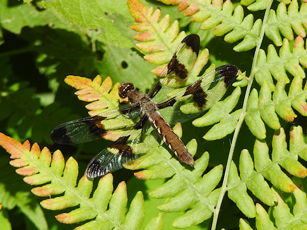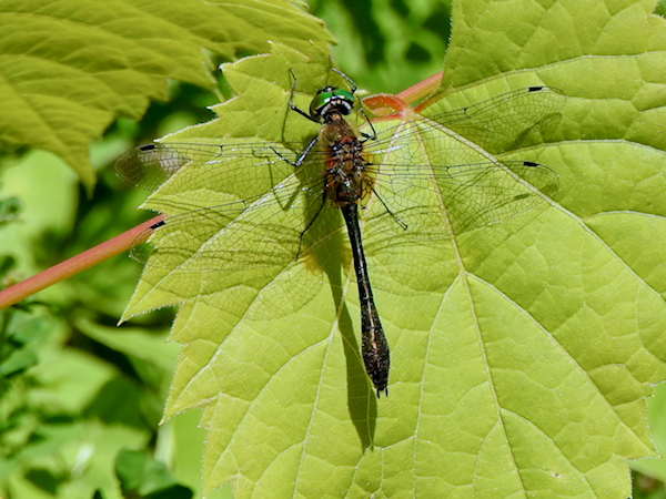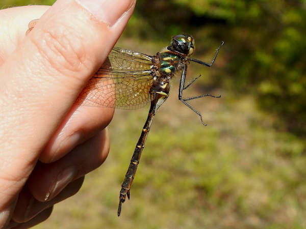 I turned around and headed back the way I had come. There were no Ebony Boghaunters flying, nor any Harlequin Darners. I did see a Common Green Darner and two Canada Darners which landed on tree trunks low enough for me to photograph. Once I reached the open meadow again I stopped to look for the emeralds flying about; I found one Racket-tailed Emerald and one Brush-tipped Emerald, which I caught.
