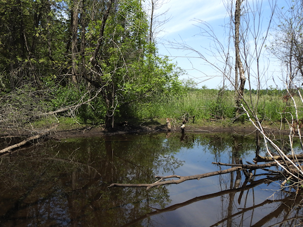While Marlborough Forest is usually one of the first places I start dragon-hunting each year in May, this year I didn’t make it there until June 21st…prime time to turn up some rarities. I started my day at a new spot along Kettles Road. I had been birding here before when a rare Yellow-billed Cuckoo turned up one spring (missed it) and was intrigued by the stream that runs under the road. There are two trails at the eastern end of Kettles, one heading directly south which I had walked before, and the other heading east which I had not. I was hoping the eastern trail would allow me to get closer to the Richmond fen and any Somatochlora emeralds, but first I stopped at the bridge to scan the stream for odes.