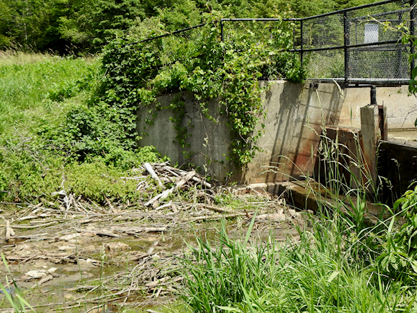 The water at the pond was lower than usual. This was the first time I had visited the pond where no water was rushing over the dam below the metal bridge; I was able to descend the bank and walk right up to the base of the dam. Normally this is a great spot to see clubtails and skimmers resting on the branches above the running water and frogs in the pool of water below, but the pools had mostly dried up.