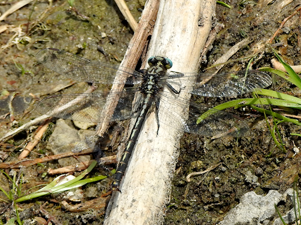 I turned around after that, not wanting to spend too much time at the trail as I wanted to see what was flying at Roger’s Pond. I returned to the culvert to make one final attempt to photograph the spiketail so I could confirm it as the Twin-spotted Spiketail and add it to iNaturalist; I ended up talking with a couple there for a short time, during which I noticed the spiketail finally land on a tree branch hanging above the stream. To my utter surprise it was not the Twin-spotted Spiketail, but rather an Arrowhead Spiketail! I made my way down to the water, descending the steep bank with caution until I had a clear view of the spiketail. I got some great photos of it, and while I don’t know what happened to the Twin-spotted Spiketail – or even if the two species could coexist at the same stream – I was thrilled to add this species to the list of odes in Marlborough Forest.