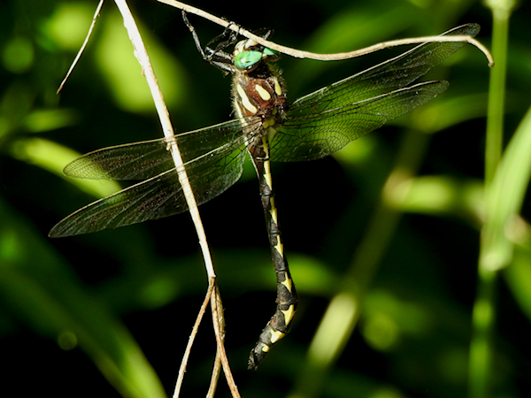 Like many dragonflies, their eyes are green at maturity. Males and females are slightly different in appearance: the male has a thin black abdomen with a few yellow spots near the top and bottom and a medium-sized club at the tip; females have a thicker, unclubbed abdomen and a row of yellow spots along the top of the entire abdomen. Both sexes have a large yellow spot on segment 7 which is visible in flight.