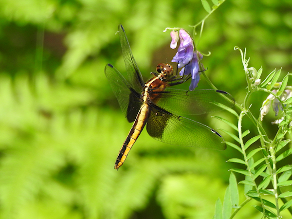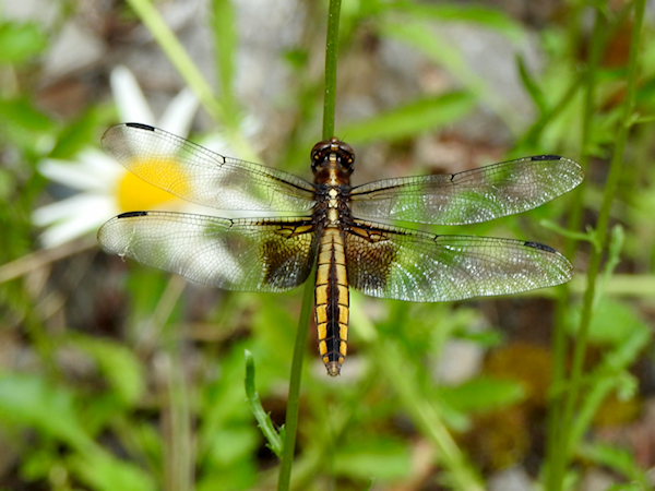 A Slaty Skimmer resting on the top of a branch caught my attention -it was yellow instead of blue, and I thought it was a Widow Skimmer until I realized it lacked the black patches at the base of its wings. The immature Widow Skimmers were numerous, and we found more than a few perching in picturesque locations, such as this immature individual dangling from a cow vetch blossom and others in an area full of daisies.