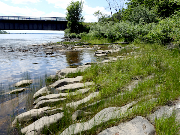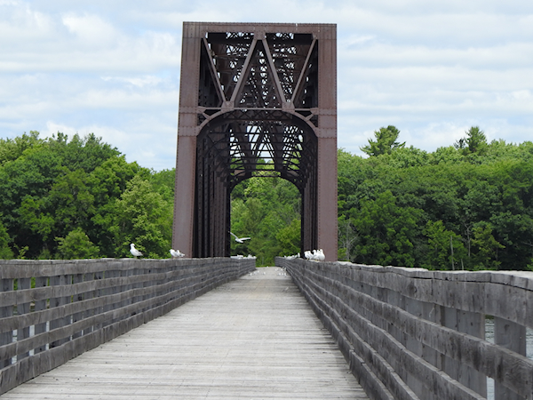 There weren’t many damselflies around, but when I started seeing Powdered Dancers resting on the gravel trail I began to suspect we were nearing the water. Sure enough we rounded a bend and the bridge came into sight – a magnificent structure of 0.5 kilometres according to the sign next to it.