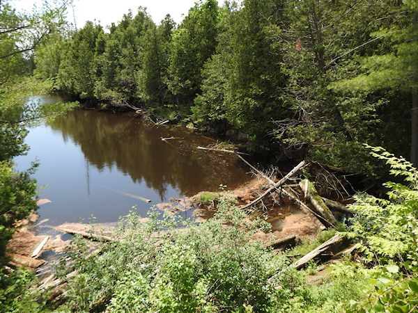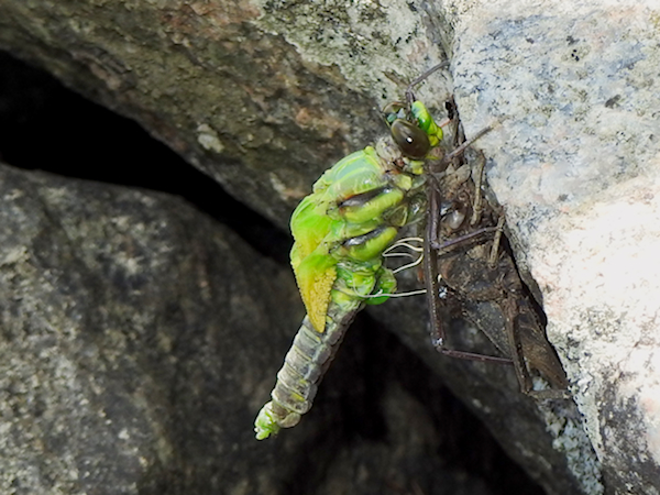 That was the first good dragonfly of our walk, and one we had hoped to find. Things got even interesting when we got to the “stream”, which turned out to be two small inlets meeting the base of the raised snowmobile trails directly opposite each other. One was surrounded by forest and full of emergent vegetation and had at least one darner patrolling the surface; the other looked like a lake in Algonquin Park with boulders descending to the water on one side and rock cliff jutting up from the other. The boulders looked like a good spot to stop and eat our lunch so we slid down what looked an otter slide and made our way to the water’s edge. Chris saw what looked like a mink but I missed it.