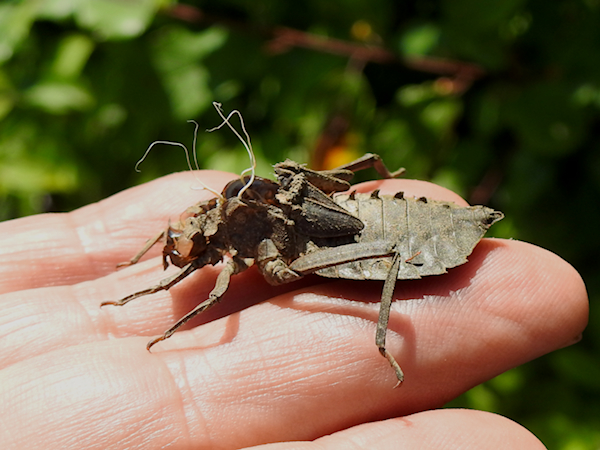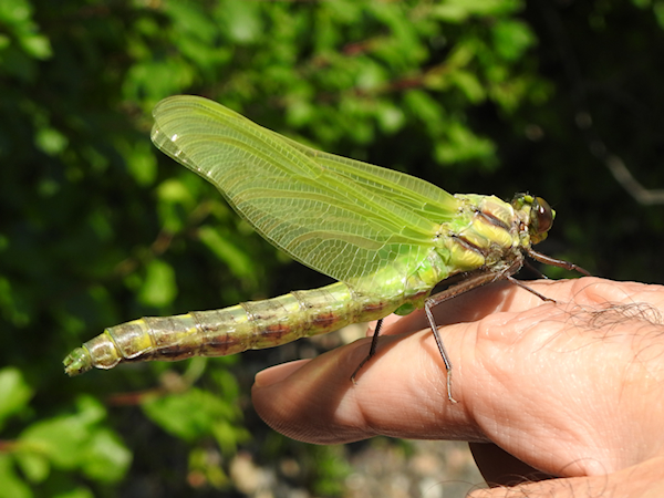 We returned to check on the Dragonhunter and found that both its abdomen and wings had almost inflated to full size. Chris picked up the exuvia so we could examine it. Note how large it is on his fingers!