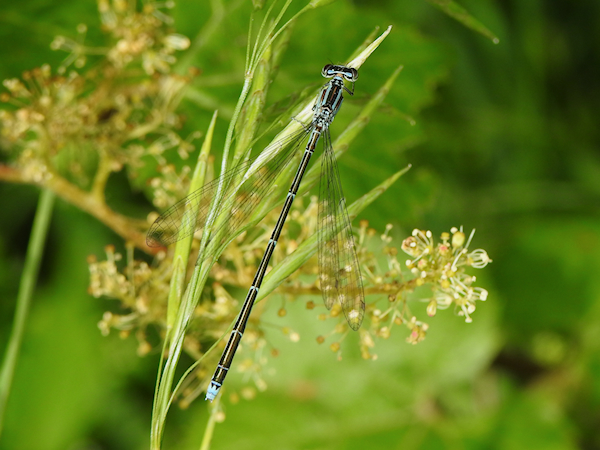 When I got to the opening onto the river about two-thirds of the way down the park I finally found two Rainbow Bluets, a male and a female. It made me happy to be able to confirm they were still present to my Montreal correspondent; I watched them for a bit trying to get some decent photos. Only the male cooperated. When I wrote to Pierre later that night, he was glad to hear the news and told me he would be visiting this weekend to look for them.