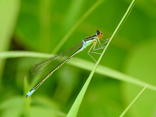 The Sedge Sprite is much smaller and metallic green in colour. Unlike the bluets, it has no shoulder stripes or spots on top of the eyes.