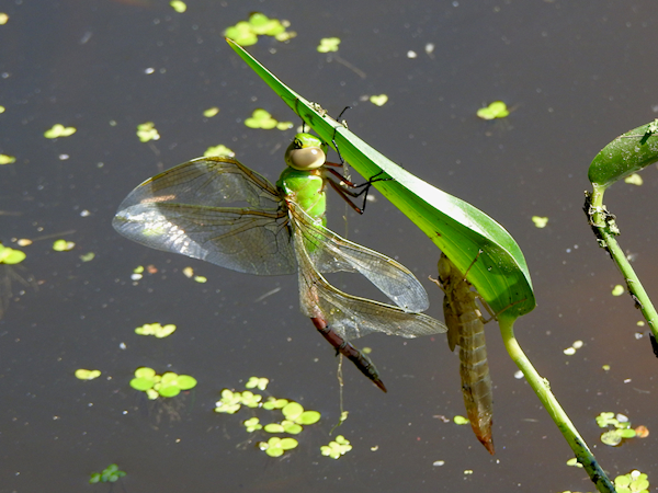 However, I was startled to see a Common Green Darner hanging from the leaf of one of the plants, both sets of wings curling as a result of a difficult emergence. The exuvia was hanging from the same leaf, indicating that the darner had been there for some time.