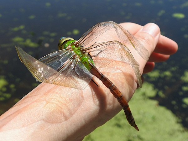 I placed the damaged insect on a leaf to await its fate. Interestingly, this the second Common Green Darner I’ve seen in recent years that had emerged with damaged wings. I’ve never seen any other darner species with this issue.