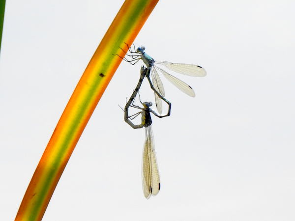 Then my eye was caught by something else – a pair of damselflies mating while hanging onto a reed above the water. They were too far away to get a good look at them; however, I could tell they were spreadwings, which are not unusual along the edge of the pond. I was going to leave it at that, and grabbed some documentary shots to look at later. It wasn’t until I got home that I realized that the wings of the mating damselflies both had a very distinct amber tint to them, leaving no doubt in my mind that these were Amber-winged Spreadwings – a new species for the pond!