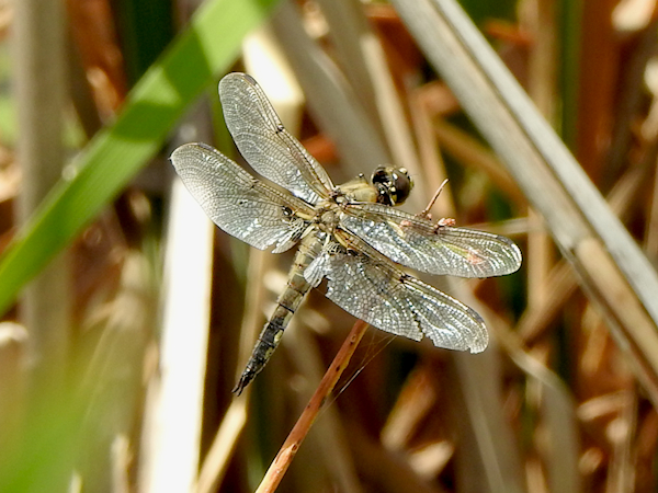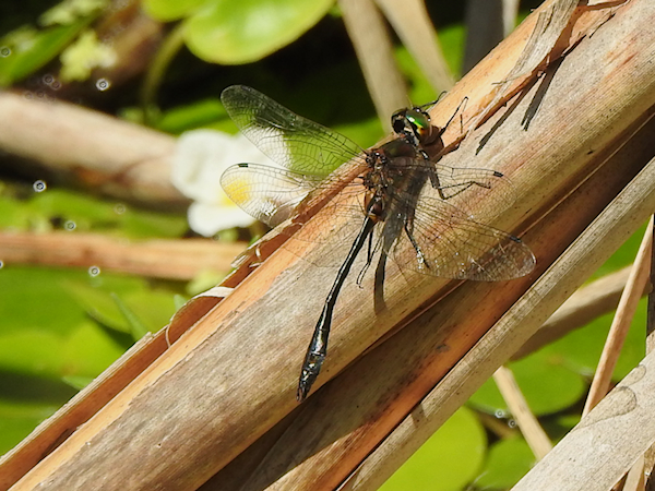 I was also happy to see a Widow Skimmer, two Four-spotted Skimmers, and a single Blue Dasher among the skimmers at the water. There were no clubtails on this visit, but a curious Common Green Darner kept flying in and out of the clumps of reeds while several Racket-tailed Emeralds patrolled the water below the boardwalk.