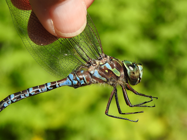 A Common Green Darner again was searching for food among the channels near the boardwalk, and several mosaic darners (genus Aeshna) were flying over the water and above the boardwalk. I caught one, hoping for a Lake Darner, but it turned out to be a Canada Darner.