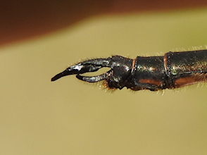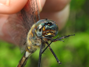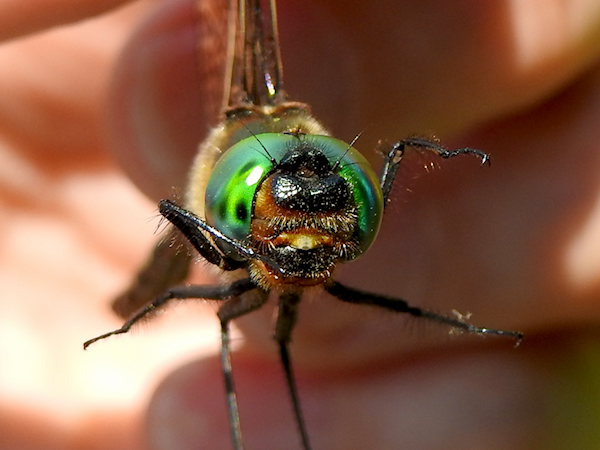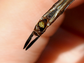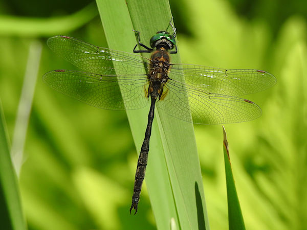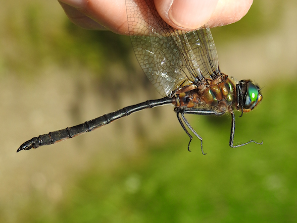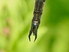 The upper claspers on many male Somatochlora emeralds curl upwards at the tip, resembling elf’s shoes or skis. These ones curved downward. From above they resemble pincers, a shape it shares with Incurvate, Forcipate and Delicate Emeralds in our region.