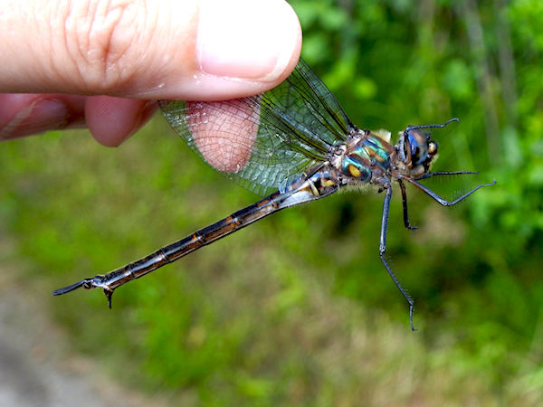 There are a few more sunny openings through the woods, and at one boardwalk I encountered a single emerald flying back and forth. When it came down to about shoulder height I caught it, and was delighted to find a male Brush-tipped Emerald. The hairy claspers are fairly unique; the only other Somatochlora emerald in our region with hairy claspers is the Williamson’s Emerald, which is much larger and proportionately longer.