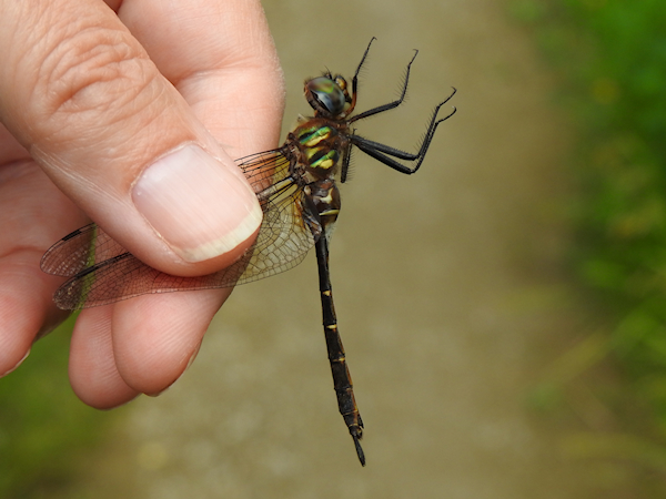 Although the sun wasn’t out by the time I returned to the straight trail through the marsh, there were a few emeralds flying up and down the corridor. I managed to catch two Brush-tipped Emeralds, both males. Then I saw one that looked longer zooming up and down the trail. I positioned myself to catch it, but instead of flying past me it zipped up and over the shrubs lining the trail and flew out over the marsh. I waited to see if it would come back, and when it didn’t I continued on my way.