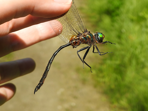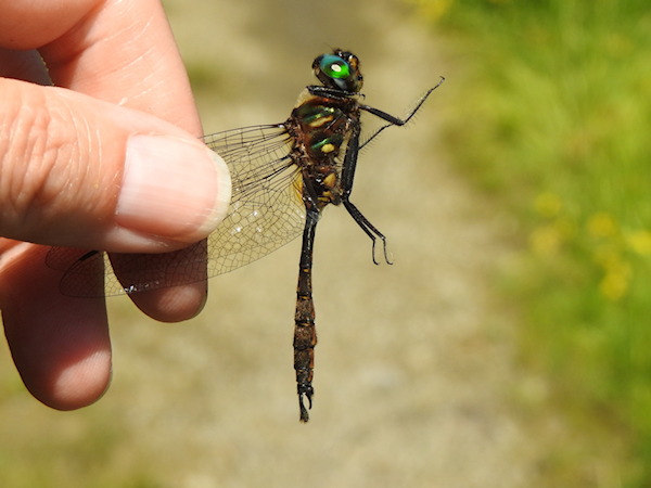 By the time I reached the end of the corridor the sun was out, and I had re-found my large mystery emerald. This time when it flew toward me it went right by me, and I caught it. I was delighted to see this large Somatochlora male in my hand when I pulled it out. The first thing I noticed is that there were no yellow spots on the sides of the thorax, as would be expected on a Williamson’s Emerald, the only other Somatochlora emerald I’ve seen at Jack Pine Trail. The second thing I noticed was that the claspers were not ski-shaped, which narrowed down the species to just two: Delicate and Kennedy’s.