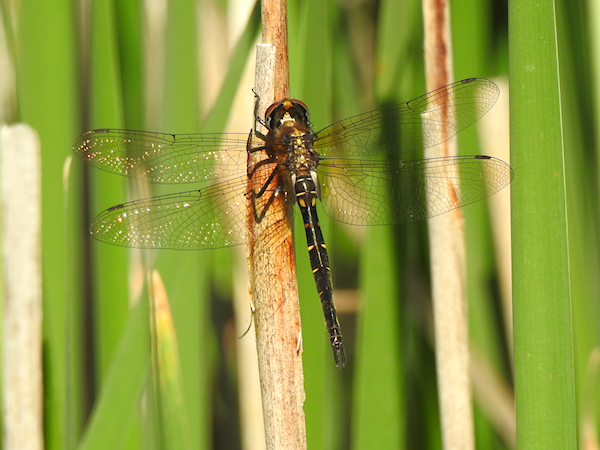 I was so thrilled with that discovery that the next day I returned to see if I could find a female to photograph; that would mean they were certainly breeding in the area. Unforunately I didn’t see any large emeralds patrolling the marsh trail I now think of as the “emerald corridor,” but I did find two female Brush-tipped Emeralds perching low enough to photograph! The yellow dashes along the sides of the upper segments of the abdomen are visible here, as are the long upper claspers. Her eyes are brown, indicating she emerged a short time ago.