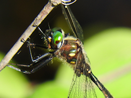 There is a small channel of water that runs south from the Eagleson storm water pond system through farmland before reaching the Jock River at Terry Carisse Park. It has enough of a current to keep it open during mild winters, and I suppose it is just as likely that the River Jewelwing flew up the channel as it is that it flew or was blown south from Stillwater Creek. It’s a mystery as to where it came from and where it was going when it found the ponds, and I expect this to be a one-time visit rather than the harbinger of a new population of River Jewelwings at the ponds.