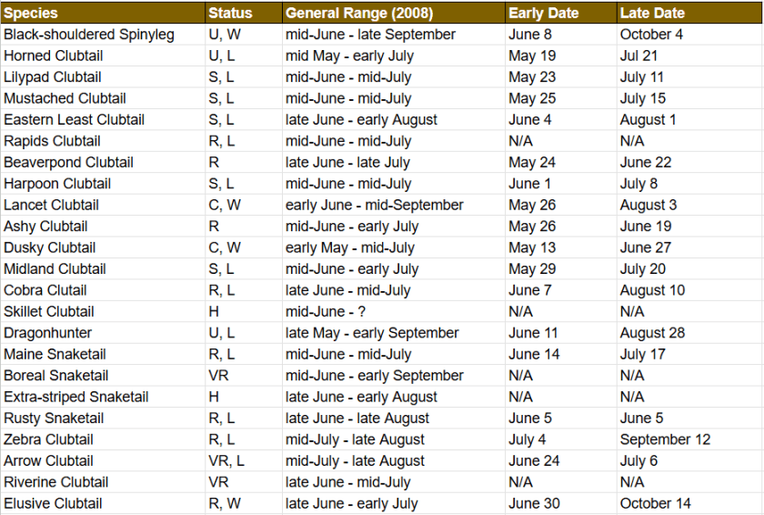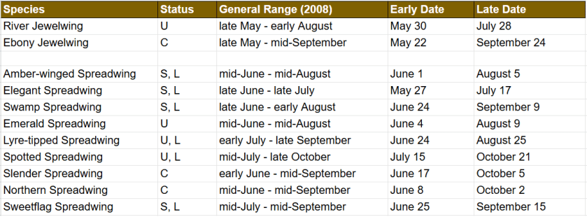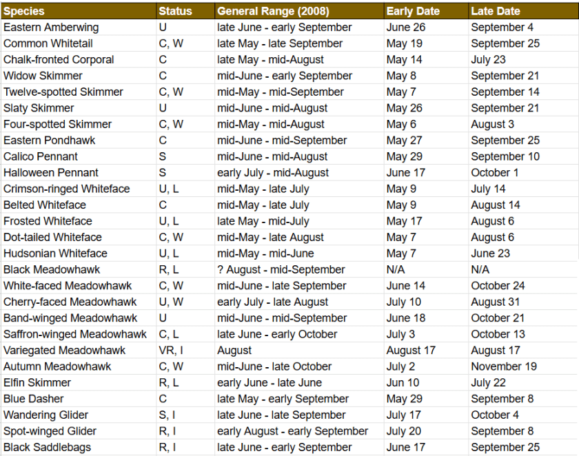 The below list attempts to fill in the general flight season from the Bracken & Lewis checklist with actual dates gleaned by my own observations, those provided by Christina Lewis during our many talks, and those recorded on iNaturalist. These are observations of adults only, as the larvae (nymphs) are present below the water’s surface year-round and beyond the scope of this website. Unfortunately I was not the record-keeper that Christina was in my early days as I was excited just to identify them and add new species to my life list – in contrast, she kept track of everything she saw when she went out, and so much valuable data has been lost with her passing early in 2025. In this way I hope to provide a fuller picture of the flight seasons of Ottawa’s odonates.